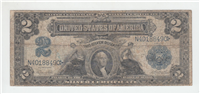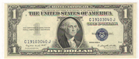 7-3/8 inches by 3 inches. Black with blue seal and black machined serial number. Green back with 1902-1908. Bust of President William McKinley, left.