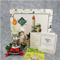 5-1/2 inches tall. Charming Tails Collection. 'You Make The Season Glow' Mouse on Candle Stick Christmas Figurine with battery powered candle light (Batteries included). Circa 2007. Sculpted in resin. Designed by Dean Griff. Produced by Fitz and Floyd (now produced by Enesco).