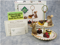 2-1/2 inches tall. 4-1/8 inches wide. Charming Tails Collection. 'Bubbly Good Friends' Mice Blowing Bubbles on Bubble Gum Candy Figurine. Sculpted in resin. Designed by Dean Griff. Produced by Fitz and Floyd.