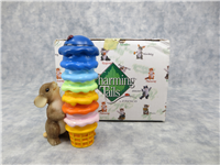 4-1/4 inches tall. Charming Tails Collection. 'Singing Snow Tunes' Christmas Caroling Figurine. Circa 2007. Sculpted in resin. Designed by Dean Griff. Produced by Fitz and Floyd (later produced by Enesco).