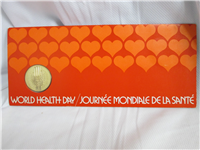 World Health Day medal. 1 1/2 inches in diameter and is stamped "GOLD ELECTROPLATING ON STERLING" on the edge. The cover is post marked 7 IV 1972, Ottawa Ontario Canada, the official first day of issue.