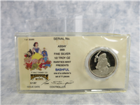 Rarities Mint. Strictly Limited Edition of 20,000 medals. 1/2 troy ounce .999 Fine Silver proof medal commemorating the 50th Anniversary of Walt Disney's Snow White and the Seven Dwarfs, released in 1937. 30 mm medal is encased in a hard plastic coin holder on a serially numbered Certificate of Authenticity card, certified 6/1/87.