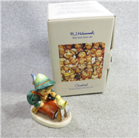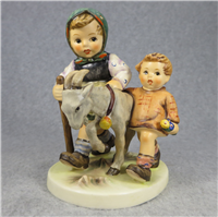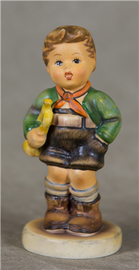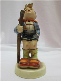 Third (and last) in the Trio Collection. Limited edition of 20,000. 5 inches tall by 4-1/2 inches wide at base not including separate wooden base. Base of figurine is incised 787 and 1995. Goebel TMK 7 and 'Auf Wiederschaft / Traveling Trio / No. --- of 20,000 / M. I. Hummel / 1998 / THIRD EDITION / Trio Collection' imprinted in blue on bottom of base. Painter hand-initialed in black ink on bottom of base.