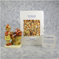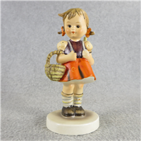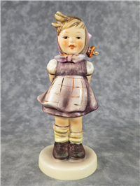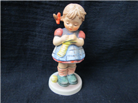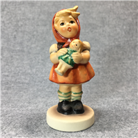 Size 4-1/2” to 4-3/4”. TMK: 1-8. First modeled by master sculptor Arthur Moeller in 1937 but has been restyled in recent years. Sight difference in hair ribbon on girl. Old name: “Little Doll Mother” or “Little Mother of Dolls” in some catalogues. An unusual painting variation has recently been found with a white blanket with red cross stripes instead of the normal pink color and red stripes, in (TM 1) trademark. A special “60th Anniversary” figurine of “Doll Mother” was issued in 1997 with a special backstamp and a round gold medallion with: “Hummel 67 Doll Mother 1937-1997 (and) 60th” in a round circle. This figurine was first introduced at the Leipzig Trade Fair in 1937.