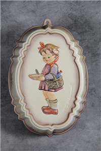 7-1/2 inches in diameter. Hum 669. Goebel TMK 6 trademark imprinted in blue ink and painter hand-initialed and dated in black ink on inside of mould.