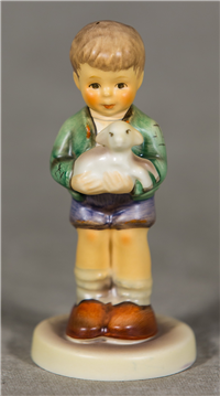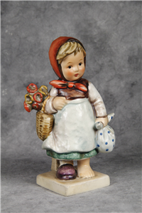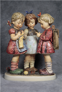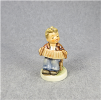 Size: 2-3/4” to 3”. TMK: 1-8. First modeled by master sculptor Arthur Moeller in 1937. Some variations in size between old and new models. Sometimes a slight variation in tilt of boy’s head and position of hand. Old name: “Duet” or “Critic.” “Singing Lesson” is the motif used on the 1979 Annual Plate, Hummel 272. Sometimes found with no “dots” on horn. Older models have a donut base while newer models have a plain base. Also found with either one, two or three flowers on hat.