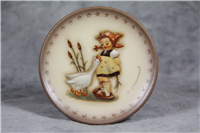 4 inches in diameter. Front is embossed with the Goebel TMK 5, 'Wir Danken Fur Ihren Besuch' ('Thank You For Your Visit'), and an image of the Merry Wanderer figurine. Back is embossed with the Goebel TMK 5 and 'A keepsake from the birthplace of the "Hummel" figurines; Goebel Rodental, Bavaria, W-Germany'. (c) Goebel 1981 printed on the box.