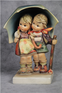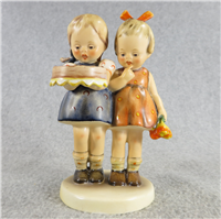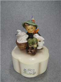 Sizes: 5-1/2” to 6-3/4”. Bowl style first produced in 1936. Jar style first produced and sold in 1964. Sometimes found incised with number III 58/0 on the old bowl style pieces. Model number is found on underside of lid. "M.I. Hummel" signature is found on top side of lid directly behind figure. “Playmates” candy box was "Temporarily Withdrawn" (TW) from production on 31 December 1989. In 1996 a new music box was produced with model number IV/58 applied by decal on the bottom. This is one of four in a series of music boxes produced for the European market only at one time. In 1996, a new "M.I. Hummel" collector box was issued through The Danbury Mint, Norwalk, CT and sold by mail order only. It is the same was the “jar” style box. The only difference is that color graphics have been added.