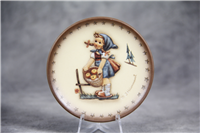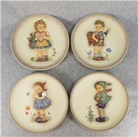 Complete set of 4 miniature plates, each 4 inches in diameter. Each is imprinted HUM 741, 742, 743 and 744, respectively, in blue. Goebel TMK 6 trademark also imprinted in blue on back, along with descriptive text about the series. Artist hand initialed and dated in black ink.