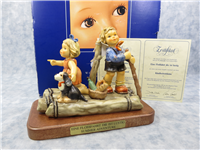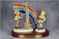 The set together measures 7-1/4 tall by 8-1/2 inches wide (including base). The brass nameplate on wooden base reads 'Commemorating the 10 Year Anniversary of the Fall of the Berlin Wall and the Sweet Glow of Freedom for All of Germany; 1989 - November - 1999'. The set includes 2 Hummel figurines, #829 "Where to Go" and #109/0 "Happy Traveller". Hummel #829 is 6-1/4 inches tall. Base is incised 829 and 1999. Goebel TMK 8 and 'Number ____ in a worldwide Limited Edition of 5,000' imprinted in blue ink. Colored imprints of German and United States flags. Artist hand-initialed and dated in black ink. Figurine base is incised 331 and 1955 and has Goebel TMK 7 trademark imprinted in blue on bottom of base and has full color painted flags of Germany and United States. Artist hand initialed and dated in black ink.
