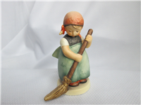 Size: 4-1/2” to 7”. Originally modeled by master sculptor Reinhold Unger in 1937. Has been restyled several times through the years. Many size variations. Full bee models are usually the largest size. Old name: “Under One Roof.” Slight difference between old and new models other than size. Several variations in structure of bottom of base design. This motif was used for the first Anniversary Plate, Hummel 280, in 1975. A new small size (71 2/0) was issued in the spring of 1985. The large size has now been renumbered 71/1. There are two variations of the new small size. The first production appeared with the inside of the umbrella hand painted with obvious brush strokes while later production has the inside painted by airbrush. A special painting variation of the small size Hummel 71 2/0 was produced in 1997 for QVC television program and sold by mail order. It was painted with a yellow umbrella with tan colored highlights, a decal signature on back of the umbrella and a special “60th Anniversary” back stamp and was available at local dealers.