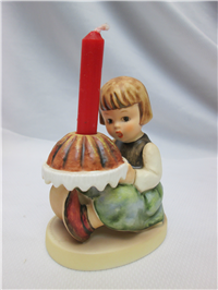 3 1/2 inches tall. Base is incised 338 and 1956.. Goebel TMK 6 trademark imprinted in blue on bottom of base. Artist hand initialed and dated in black ink. 2 1/2" red candle included.