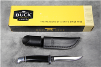 2.1 ounces. 7-1/2 inches overall. 3-5/8 inch blade. 1/16 inch thick. Made in USA. Front Tang: BUCK 107 U.S.A. Stainless Steel blade. Black Micarta handle. Nickel Silver bolster.