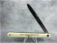Single-Blade Serrated Melon Tester Knife. 4-3/4 inches closed. 8-3/8 inches open. "STAINLESS COLONIAL PROV. U.S.A." tang stamp. Yellow composite handle etched "CITY WIDE PRODUCE 666-6190".