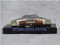 5-1/2 inches closed. 9-5/8 inches open. Made in USA. "CASE XX 5172" and "HANDMADE IN U.S.A." tang stamps. Double oval open-C "CASE" shield. Chrome vanadium blade etched "CASE XX BULLDOG" with image of a bulldog. Stag handle. Nickel Silver bolsters and brass liner.