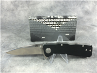 4-5/8 inches closed. 8-1/8 inches open. Made in USA. Black-coated AUS 8 Stainless Steel partially-serrated blade etched "SOG Flash II" and "Pat. 6,941,661". Features SOG Assisted Technology (S.A.T.) which employs a piston lock easily released with a sliding button. Glass-reinforced GRN handles embossed "SOG SPECIALTY KNIVES". With dual thumb studs, reversible bayonet-mounted clip, and safety lock.