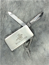 Limited Edition Knife Set. Includes a 7-3/4" fixed-blade knife, a single-blade folding lockback knife (3" closed, 5-1/4" open, "STAINLESS" tang stamp), and a 2-blade folding knife (3-1/8" close, 4-7/8" open, "STAINLESS STEEL" tang stamp). Blades etched "WINCHESTER", "2005", and the fixed knife blade is also etched "Limited Edition". Stainless Steel Blades. Pearl handles. Includes gift tin which measures 8" X 5-1/2" X 1-1/4".