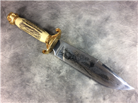 10-1/2 inches long. Made in Germany. "CARL SCHLIEPER SOLINGEN GERMANY" and Eye Brand logo tang stamps. Stainless steel blade etched "Jim Bowie Reg.U.S.Pat.Office HAND MADE". Stag with stacked leather handle. With original brown leather sheath embossed "Jim Bowie".