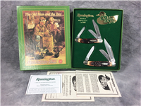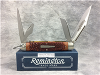 Set of 2 3-Blade stockman knives. Limited Edition 1 of only 5000 sets made. The smaller one is 3-3/8 inches closed, 5-3/4 inches open. The larger one is 3-7/8 inches closed, 6-7/8 inches open. Made in USA. Oval "Remington shields. Stainless Steel blades. Jigged imitation bone handles. Nickel silver bolsters. Brass liners. With original gift box and paperwork.