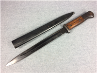 Fixed Blade Bayonet. 15 inches long overall. 9-3/4 inch blade. Wood handle. With scabbard. No visible markings of any kind. Nice vintage condition.