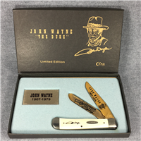 Limited Edition. 4-1/8 inches closed. 7-3/8 inches open. Made in USA. "Case XX ****** USA " (6 dot with lightning bolt S) and "3254" tang stamps. Single Oval 'Open C' CASE shield. Gold-colored chrome vanadium blades. Master blade etched "JOHN WAYNE 1907-1979" and an image of Wayne. Secondary blade etched "THE DUKE", Wayne's signature, and an image of a rifle. Yellow Composition handle etched with Wayne's signature. Nickel Silver bolsters. Front bolster etched with serial number "1023". Brass liner.