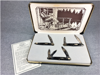 Set of three Whittler Pocket Knives. 3-1/4 inches closed. 5-3/8 inches open. Made in USA. Includes the following knife patterns: B6108 SS, B6208 SS, and B6308 SS (with corresponding tang stamps). "CASE XX **SS** USA" (4 dot with lightning bolt S - 1986 date stamp) tang stamp. Double oval 'open C' CASE shields. Stainless Steel blades. Jigged Black Bone handles. Nickel Silver bolsters with serial #1514 on front right bolsters. Brass liners. With clamshell case and certificate of authenticity.
