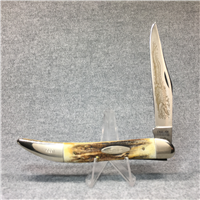 Limited edition of 5000. Music box dimensions are 9-1/4 x 5-1/2 x 3-1/4, and with bronze nameplate engraved '1985 Roy Acuff Commemorative by Case A Limited Edition of 5000'. Master blade etched 'King of Country Music' with image of Roy, second blade etched with Roy Acuff signature. 3 inches closed. 5-3/8 inches open. Made in USA. Case XX (lightning S) (5 dots) SS USA and 52131 SS tang stamp. Case Longtail C Embossed shield. Stainless Steel blades. Stag handle. Nickel Silver bolsters. Brass liner.
