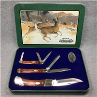 3-7/8 inches closed. 6-7/8 inches open. Made in USA. 'Remington Madison N.C. USA' tang stamp. Bullet shield. Stainless Steel blades. Master blade etched "Remington TRADE MARK". Red / Orange Delrin handle. Nickel Silver bolsters. Brass liner.