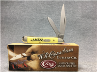 2-3/4 inches closed. 4-7/8 inches open. Made in USA. " x x*x Case XX *x*x* " (with lightning bolt S) and "USA 3220 SS" tang stamps. Double oval open-C "CASE" shield. Stainless Steel blades. Yellow composition handle. Nickel Silver bolsters. Brass liner.