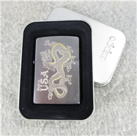 ZIPPO Chinese Dragon Lighter circa 2008. #6336. Brushed Chrome finish over Brass. Standard size 1-7/16 inches wide by 2-1/4 inches high. Bottom of lighter reads: Zippo F 08 Bradford, PA. Made in U.S.A.