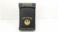ZIPPO Ruger Firearms Logo lighter circa 1998. Black Matte finish over Solid Brass. Standard size 1-7/16 inches wide by 2-1/4 inches high. Bottom of lighter reads: H Zippo XIV Bradford, PA. Made in U.S.A. Includes original G/XIV insert.