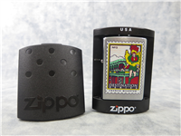 ZIPPO Blue Sunflowers lighter manufactured in 2004. Satin Chrome finish over solid brass with color printed image on front. Standard size 1-7/16 inches wide by 2-1/4 inches high. Bottom of lighter reads: B Zippo 04 Bradford, PA. Made in U.S.A. Includes original, unfired insert.