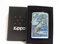ZIPPO Rampant Stallion Lighter Manufactured in 2006. Polished Chrome finish over Solid Brass with color printed front design. Standard size 1-7/16 inches wide by 2-1/4 inches high. Bottom of lighter reads: K Zippo 06 Bradford, PA. Made in U.S.A. Includes original, unfired insert.