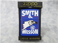 ZIPPO Smith & Wesson Lighter manufactured in 1999. Blue Matte finish over Solid Brass with color printed front design. Standard size 1-7/16 inches wide by 2-1/4 inches high. Bottom of lighter reads: K Zippo XV Bradford, PA. Made in U.S.A. Includes original, unfired insert.