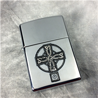 Zippo Lighter manufactured in 2002. Polished chrome finish over solid brass with front design. Standard size 1-7/16 inches wide by 2-1/4 inches high. Bottom of lighter reads: E Zippo 02 Bradford, PA. Made in U.S.A.