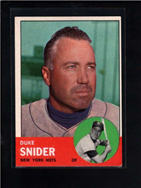 A lawsuit by Topps stopped Fleer's 1963 set at one series of 66 cards. Issued with a cookie rather than gum, the set features color photos of current players. The card backs include statistical information for 1962 and career plus a brief player biography. The cards, which measure 2-1/2" by 3-1/2", are numbered 1-66. Ab unnumbered checklist was issued with the set and is included in the complete set price in the checklist that follows. The checklist and #46 Adcock are scarce.