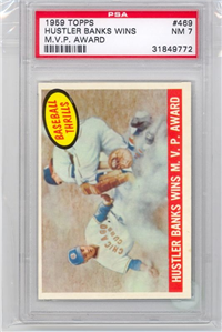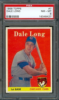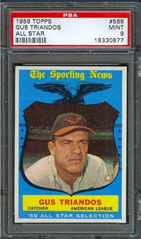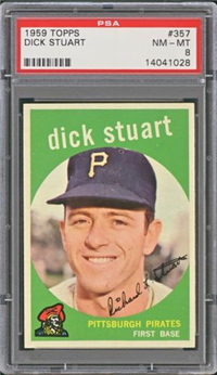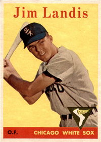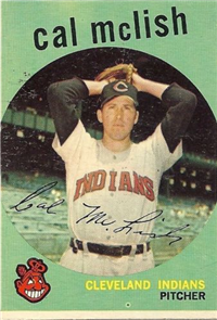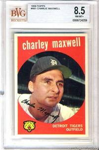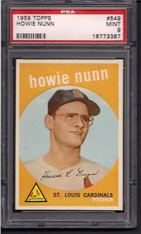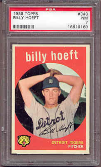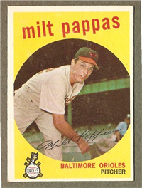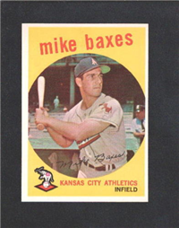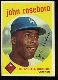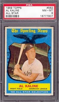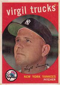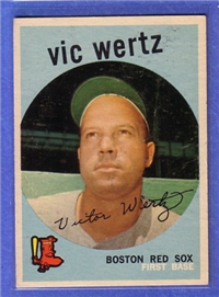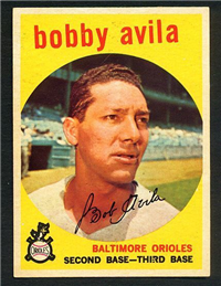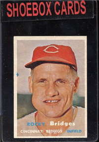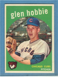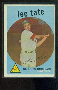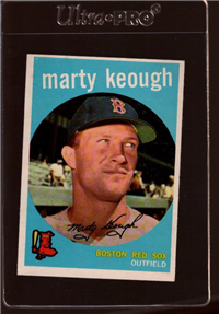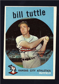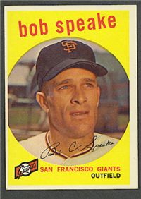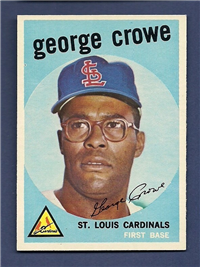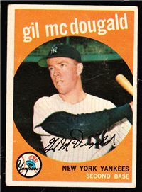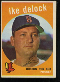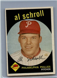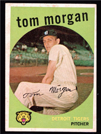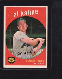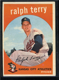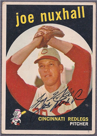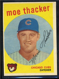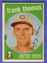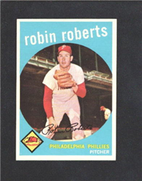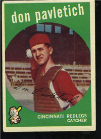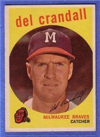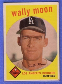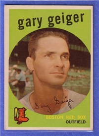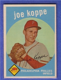 This card is one of 572 cards issued in the 1959 Topps card set--a set marking the largest set issued to that time. The cards in this set measured 2-1/2" by 3-1/2" and they have a round photograph at the center of the front with a solid-color background and white border. A facsimile autograph is found across the photo. Card numbers below #507 have red and green printing with the card numbering white in a green box. On card numbers 507 and higher, the printing is black and red and the card number is in a black box. Specialty cards include multiple-player cards, team cards with checklists, "All-Star" cards, highlights from previous season, and 31 "Rookie Stars". There is also a card of the commissioner, Ford Frick, and also one of Roy Campanella in a wheelchair. A handful of cards can be found with and without lines added to the biographies on the back indicating trades or demotions; those without the added lines added to the rare and valuable and are not included in the complete set price. Card numbers 199 through 286 can be found with either white or grey stock being the less common.