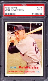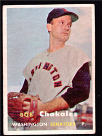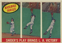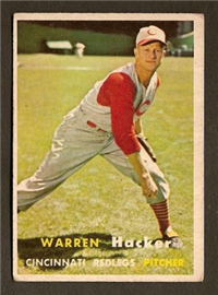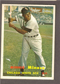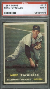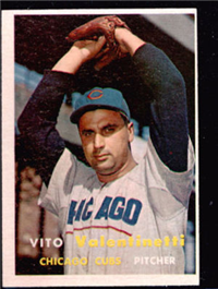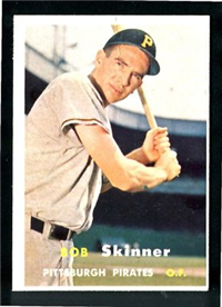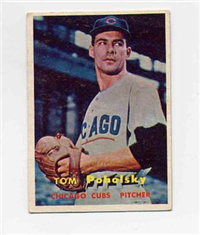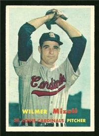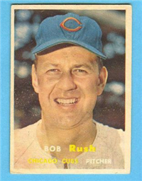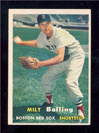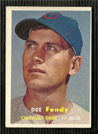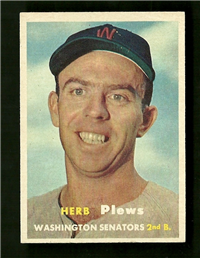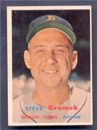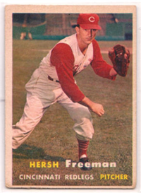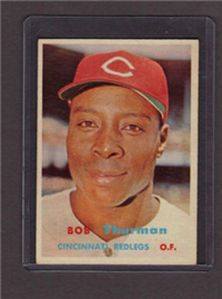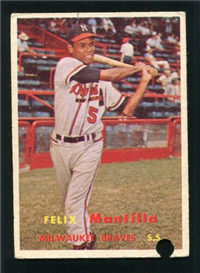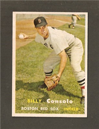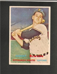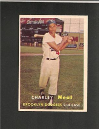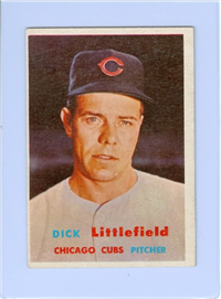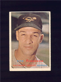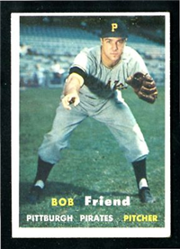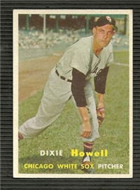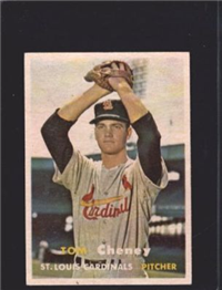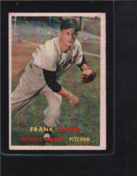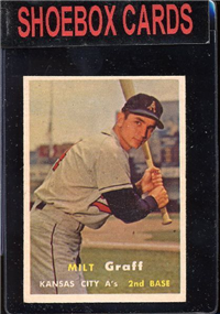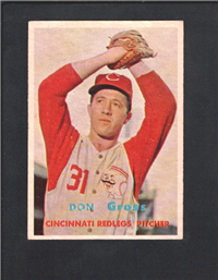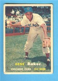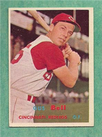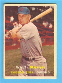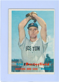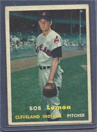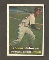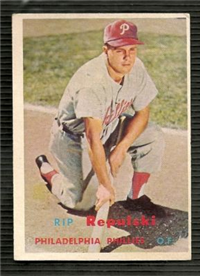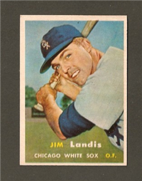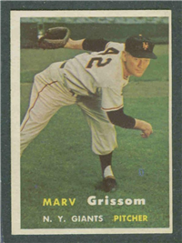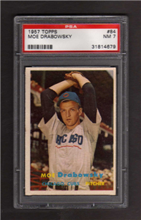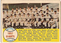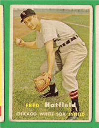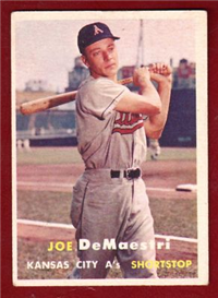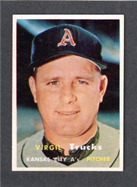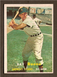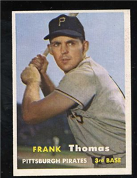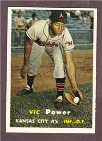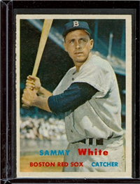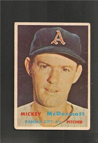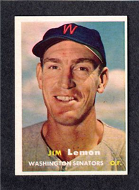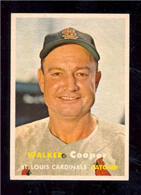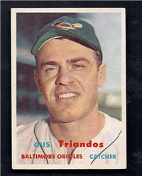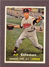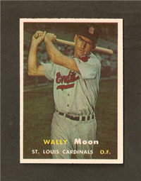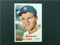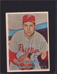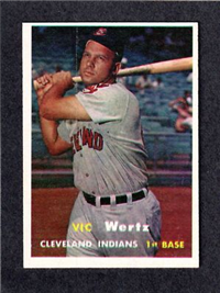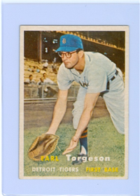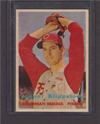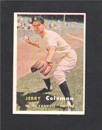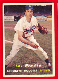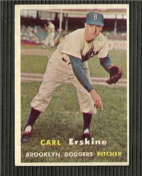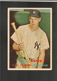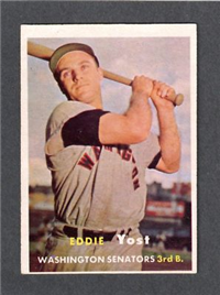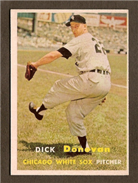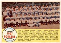For 1957, Topps reduced the size of its cards to the now-standard 2-1/2" by 3-1/2." Set size was increased to 407 cards. Another change came in the form of the use of real color photographs as opposed to the hand-colored black and whites of previous years. For the first time since 1954, there are also cards with more than one player. The two, "Dodger Sluggers" and "Yankees Power Hitters" began a trend toward the increased use of multiple-player cards. Another first-time innovation, found on the backs, is omplete players statistics. The scarce cards in the set are not the highest numbers, but rather numbers 265-352. Four unnumbered checklist cards were issued along with the set. They are quite expensive and are not included in teh complete set prices quoted below.