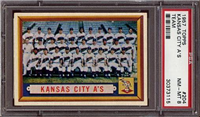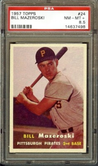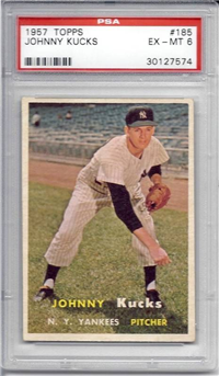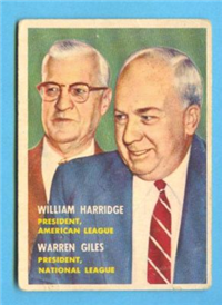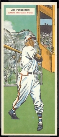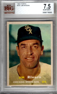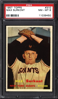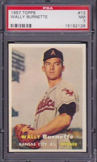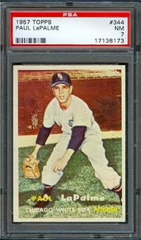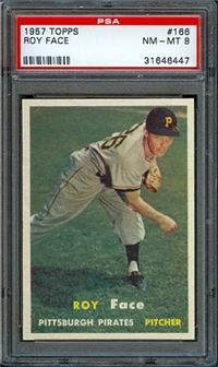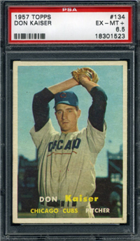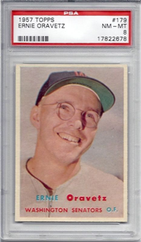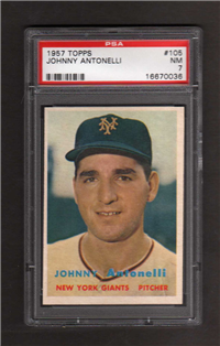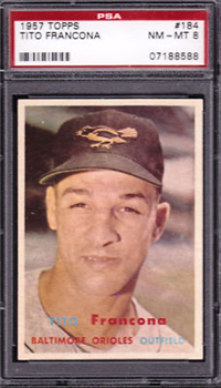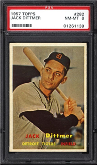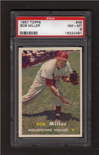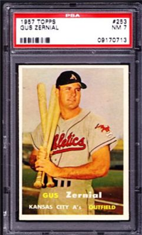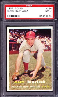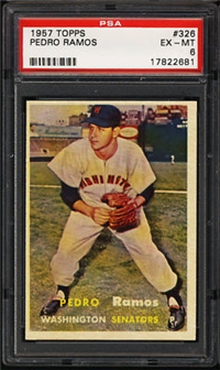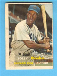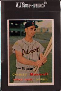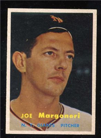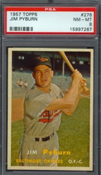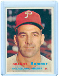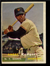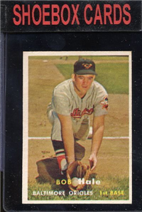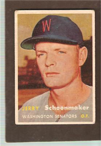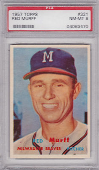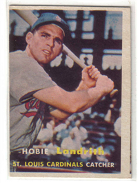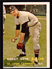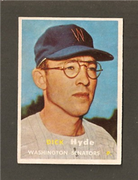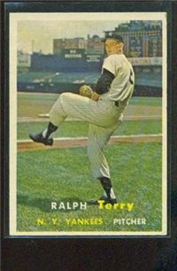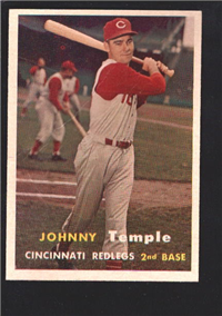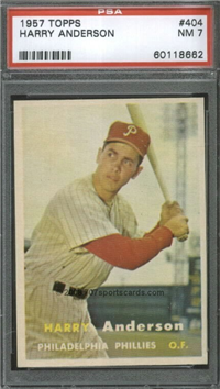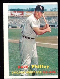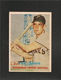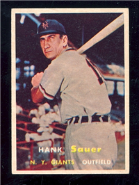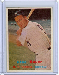 For 1957, Topps reduced the size of its cards to the now-standard 2-1/2" by 3-1/2." Set size was increased to 407 cards. Another change came in the form of the use of real color photographs as opposed to the hand-colored black and whites of previous years. For the first time since 1954, there are also cards with more than one player. The two, "Dodger Sluggers" and "Yankees Power Hitters" began a trend toward the increased use of multiple-player cards. Another first-time innovation, found on the backs, is complete player statistics. The scarce cards in the set are not the highest numbers, but rather numbers 265-352. Four unnumbered checklist cards were issued along with the set. They are quite expensive and are not included in the complete set prices quoted below.