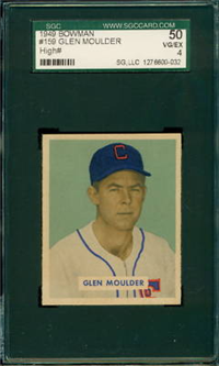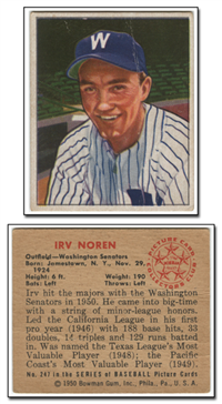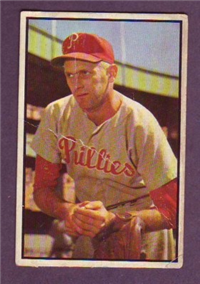In 1949, Bowman increased the size of its issue to 240 numbered cards. The cards, which measure 2-1/16" by 2-1/2 inch are black and white photos over-printed with various pastel colors. Beginning with card #109 in the set, Bowman inserted the players' names on the card fronts. Twelve cards (#'s 4, 78, 83. 84, 88, 98, 109, 124, 127, 132 and 143), which were produced in the first four series of printings, were reprinted in the seventh series with either a card front or a back modification. These variations are noted in the checklist that follows. Card #'s 1-3 and 5-73 can be found with either white or grey backs. The complete set of value in the following checklist does not include the higher priced variation cards.