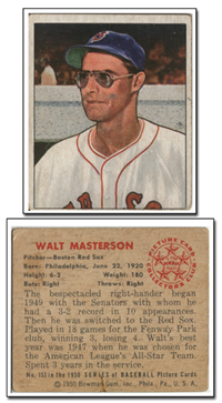 The quality of the 1950 Bowman issue showed a marked improvement over the company's previous efforts. The cards are beautiful color art reproductions of actual photographs and measure 2-1/16" by 2-1/2" in size. The card backs include the same type of information as found in the previous year's issue but are designed in a horizontal format. Cards found in the first two series of the set (#'s 1-72) are the scarcest in the issue. The backs of the final 72 cards in the set (#'s 181-252) can be found with or without the copyright line at the bottom of the card, the "without" version being the less common.