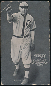 The second series of Zeenut cards measure 2 1/8" x 4 1/8" high and featured sepia-toned photographs on a brown background with no border. Most cards have blank backs, but some have been found with printing advising collectors to "save Zeenut pictures for valuable premiums." The checklist consits of 158 subjects, but more cards are still being discovered.