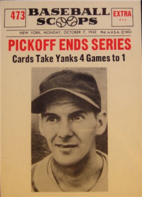 3 1/4" by 4 1/2" feature players from the New York baseball teams of the day. Unnumbered. Front: color photo with player name and facsimile autograph. Back: Promotion and statistics.