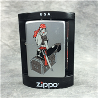 ZIPPO Jack Daniels/Bettie Page Lighter circa 2006. Street Chrome finish over solid Brass with front Polycarbonate Chip. Standard size 1-7/16 inches wide by 2-1/4 inches high. Bottom of lighter reads: A Zippo 06 Bradford, PA. Made in U.S.A. Includes original, unfired insert.