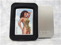 ZIPPO Bettie Page Cheetah Swimsuit Lighter manufactured in 2005. Satin Chrome Finish over solid Brass with color printed front design. Standard size 1-7/16 inches wide by 2-1/4 inches high. Bottom of lighter reads: C Zippo 05 Bradford, PA. Made in U.S.A. Includes original, unfired insert.