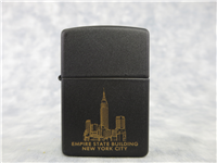 ZIPPO Empire State Building lighter manufactured in 1996. Black Matte finish over solid Brass with color printed front design. Standard size 1-7/16 inches wide by 2-1/4 inches high. Bottom of lighter reads Zippo Bradford, PA. Made in U.S.A. Includes original insert.
