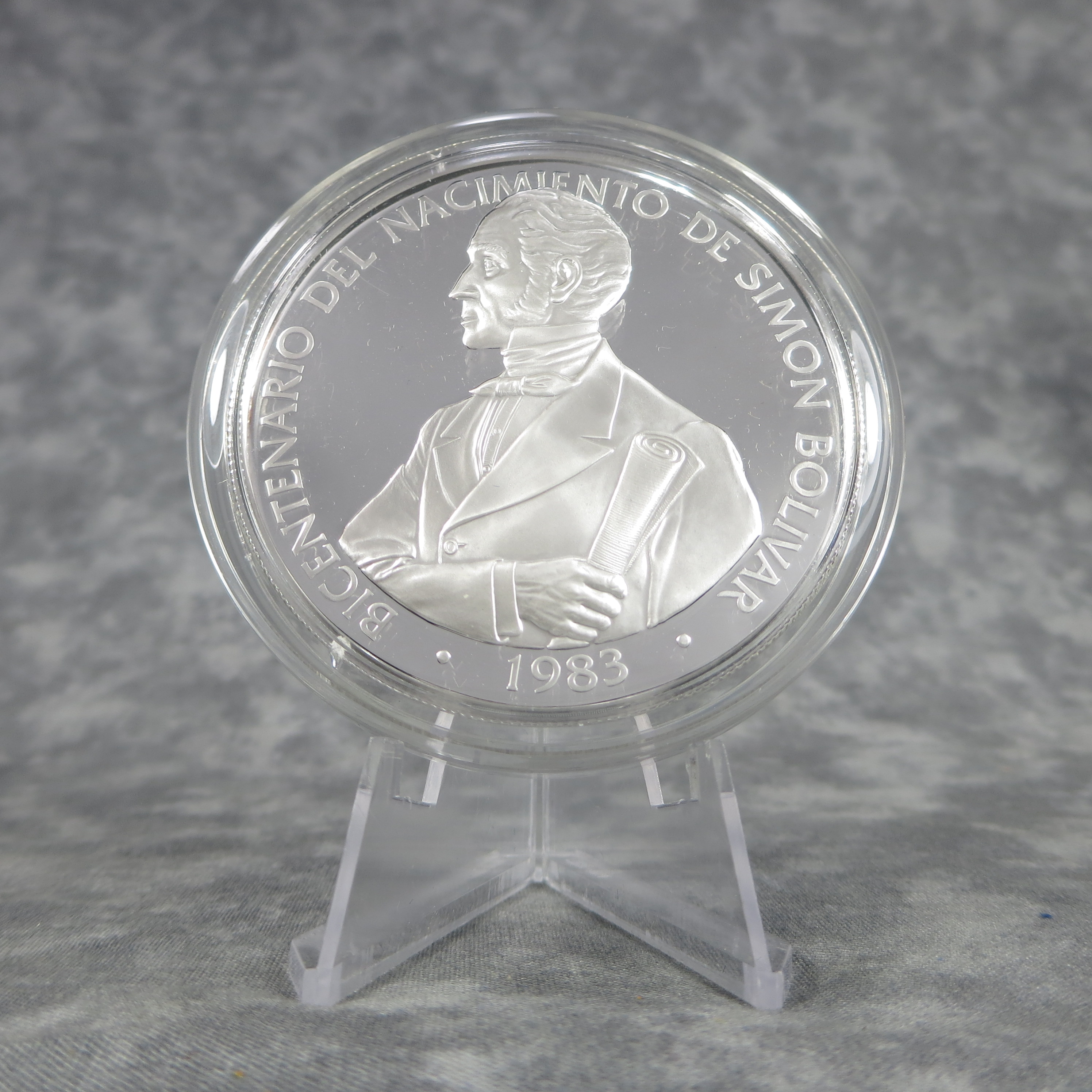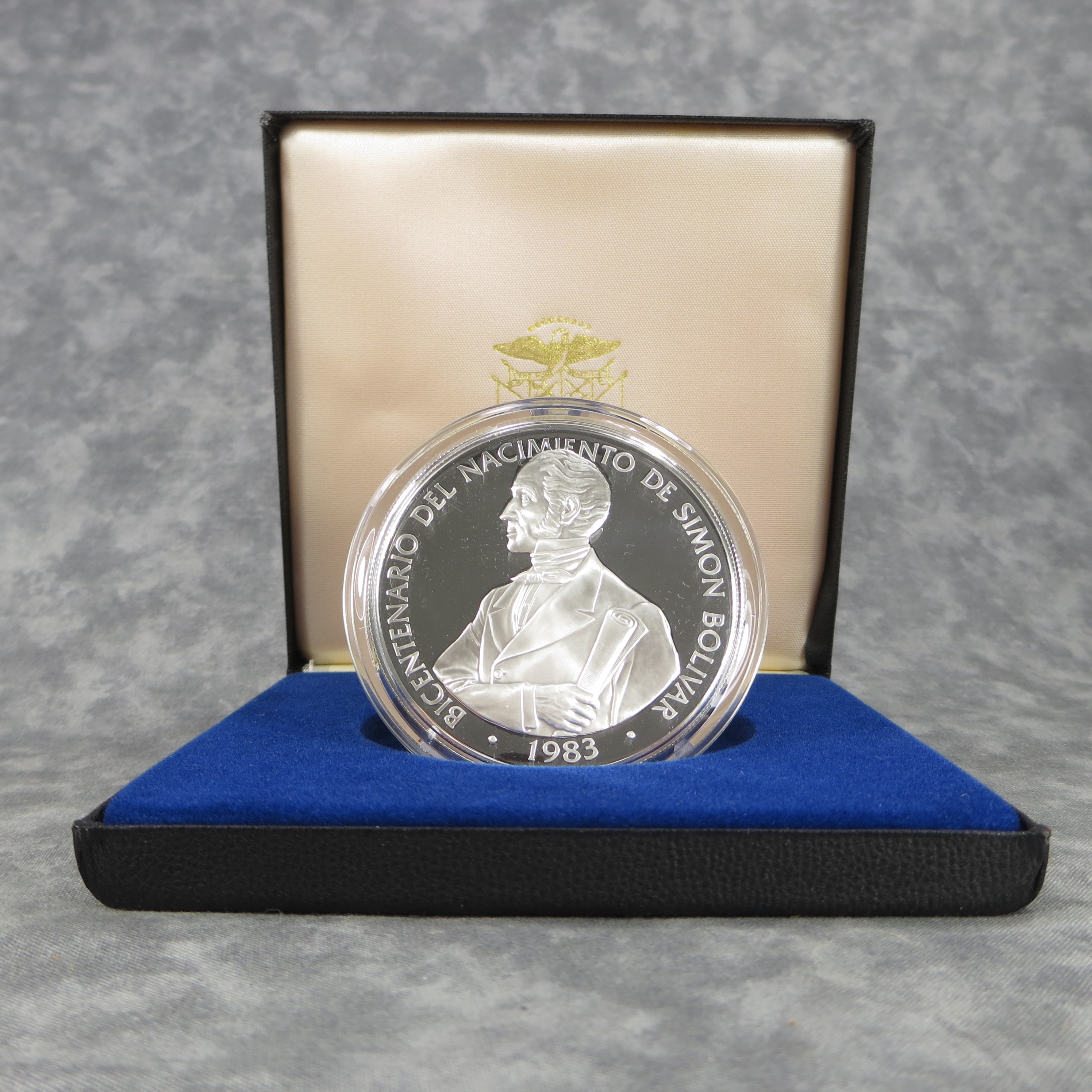 February 09, 2026 - This 60 millimeter diameter coin contains 119.96 grams of 500 Fine Silver and was issued to honor the 200th anniversary of Simon Bolivar's birth. Minted by The Franklin Mint and issued in limited edition under authorization of the government of the Republic of Panama. Certified Jan 16 1984.