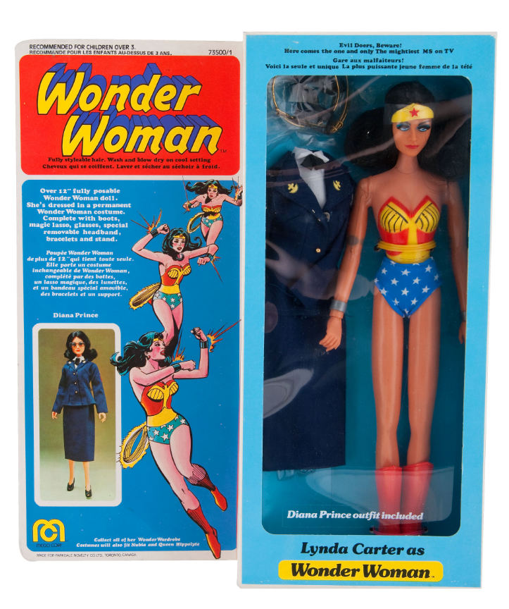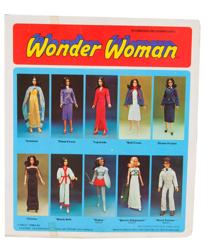 February 27, 2026 - 12x14x2" deep box w/display window contains 12" tall poseable figure of Wonder Woman. ©1976 DC Comics Inc. Parkdale Novelty Co. box. Item #73500/1. Front of sealed box includes illustrations and photo of Diana Prince, box back has photos of the seven outfits and three figures in this Mego series.  Figure is nicely designed w/long rooted hair and comes dressed in painted top with cloth shorts. Comes with alter ego, Diana Prince outfit.