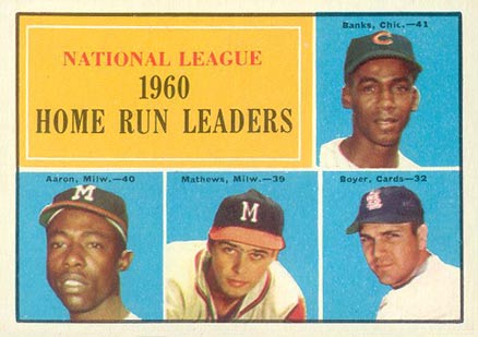 1961 Topps Baseball Card #43 N.L. Home Run Leaders (Hank Aaron, Ernie Banks, Ken Boyer, Eddie Mathews)