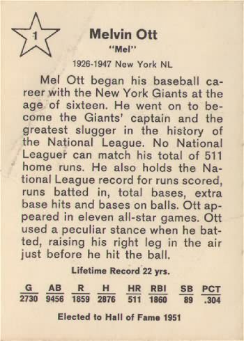 1961 Golden Press Baseball Card #1 Mel Ott (Hall of Fame)